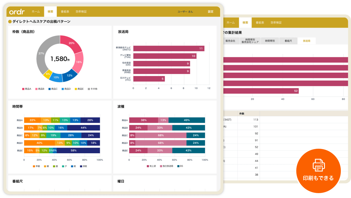 2021年4月より蓄積している独立局を含む地上波すべての放送局およびBS主要8局、CS主要24局、合計159局の通販番組約28万件/年を通販企業の媒体担当者が誰でも簡単に、競合の動向を把握しながら、自社の過去の出稿の効率検証ができます。