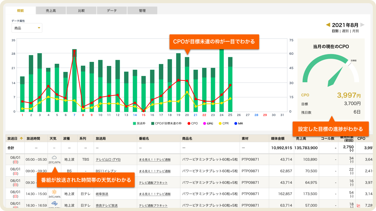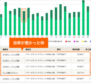 CPO等の目標値を設定すると、目標値に届かなかった放送枠を日次で抽出して一覧で見ることができ、次回のバイイングに活かせます。