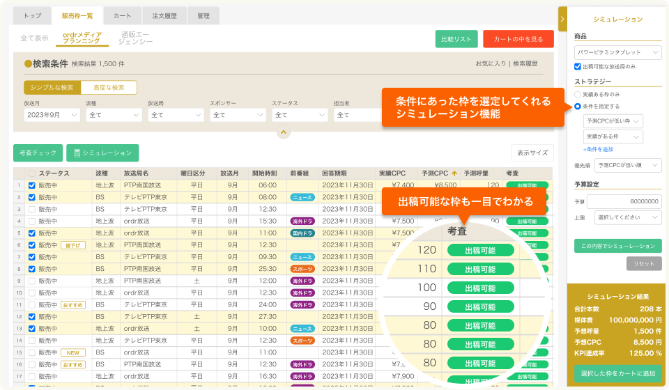 シミュレーション機能では、実績枠や前番組ジャンルや予測呼量など優先条件を指定して組み合わせることで、番組枠を瞬時に選べます。予算に合わせて枠の選定をアシストしてくれるので、バイイングの経験がなくても効率が合う枠の選定が可能になります。
