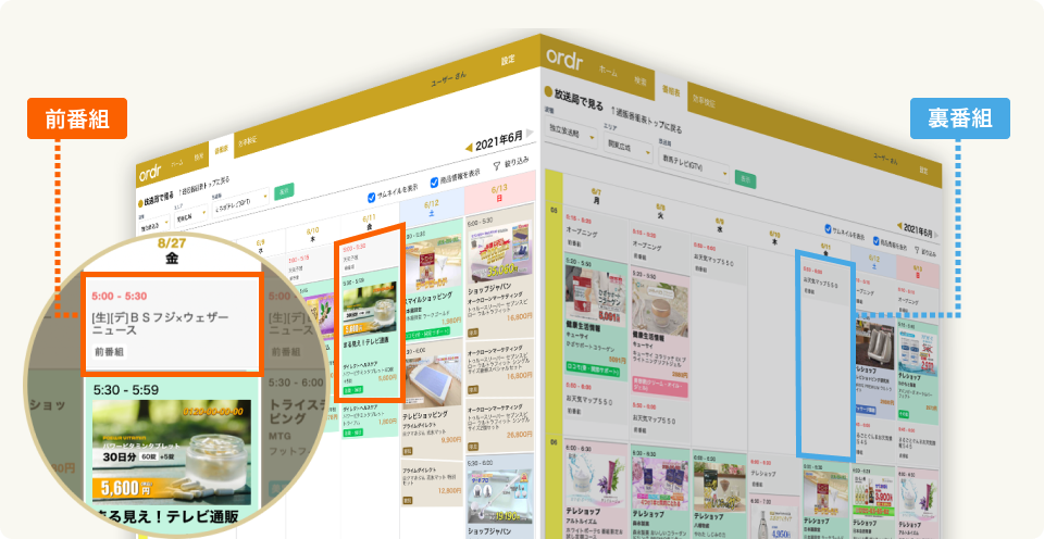 放送局別に通販番組だけを抜き出して、番組表形式で見ることができます。自社枠で効率が思ったより悪かった場合、前の番組は予定どおりだったのか確認したり、裏番組での他社と被りがなかったのかなどをチェックすることができます。