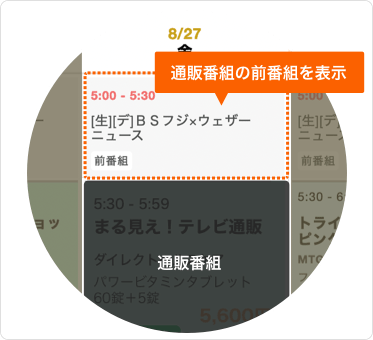 番組表の中に、商品と価格が表示されていて、カテゴリ毎に色分けもされているので、ひと目で同時間帯の通販枠状況がわかります。