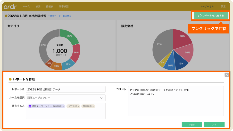 知りたいことや分析したいことをワンボタンで集計してグラフで可視化できます。データ分析は専門家の仕事になりがちですが、「ordr」では誰でも簡単にレポートを作ることができ、印刷もできるので会議資料の作成も時短ができます。