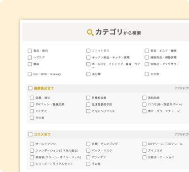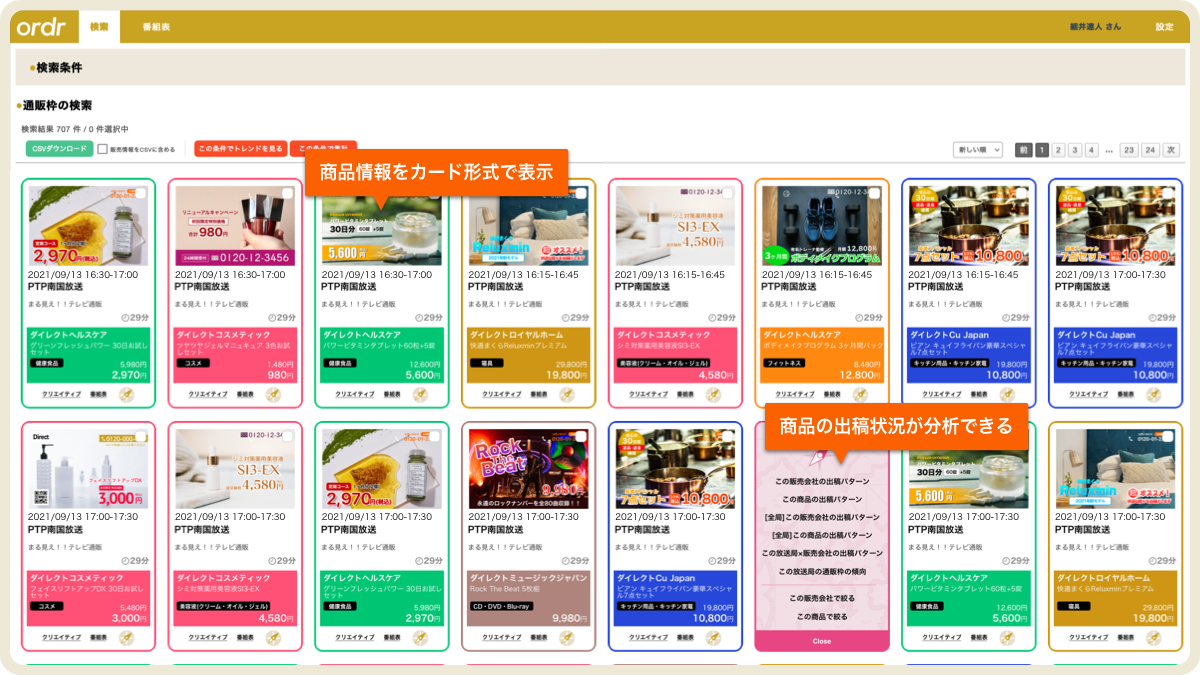 検索結果として表示される通販番組は、1つ1つの番組枠が、CTAの画像付きでカテゴリー毎に色分けされたカード形式になっています。