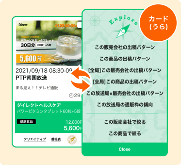 カードを裏返すと、その番組枠について詳細に分析できます。その番組枠で放送された会社や商品の出稿パターンがあっという間にわかります。(出稿パターン分析機能)