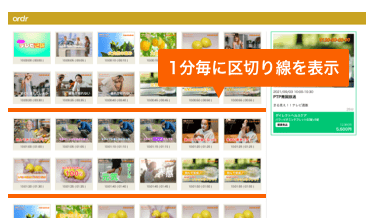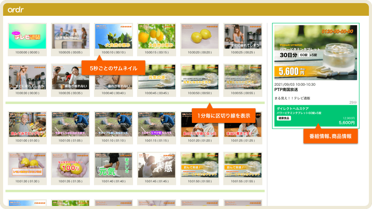 画像一覧には、1分毎に区切り線が入っているので、CTAのタイミングやパートの数など番組の構成が把握しやすくなっています。